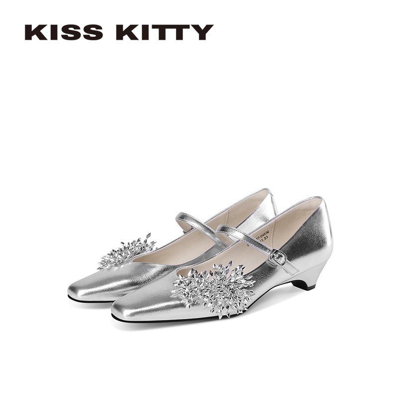 KISSKITTY玛丽珍女鞋2026春新款粗跟水钻高跟鞋不累脚方头单鞋