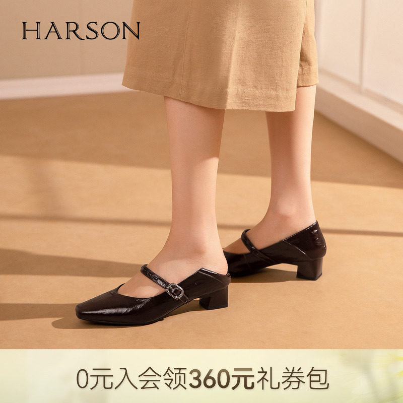哈森方头一字带粗跟真皮玛丽珍鞋两穿通勤女鞋2026新款HWS260128