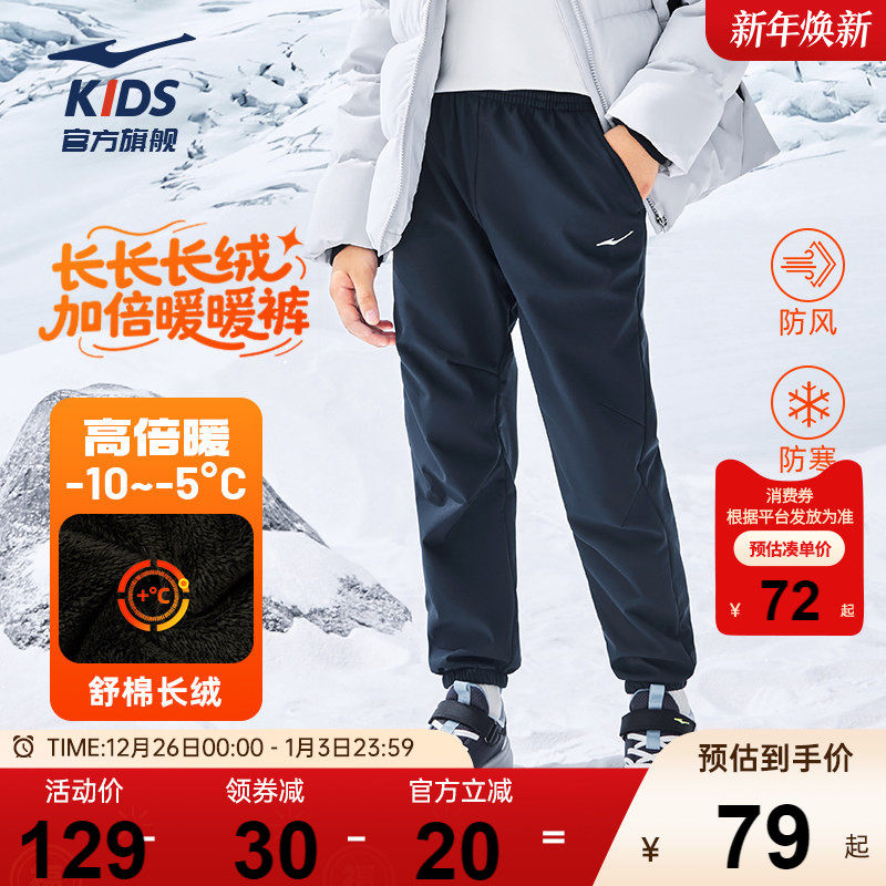 鸿星尔克童装儿童运动裤子男童加绒保暖加厚防泼水秋冬季梭织长裤