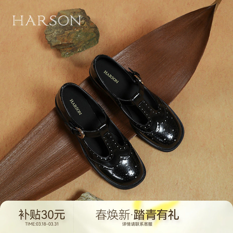 哈森玛丽珍女单鞋春季新款牛皮革布洛克丁字鞋小皮鞋HS252511