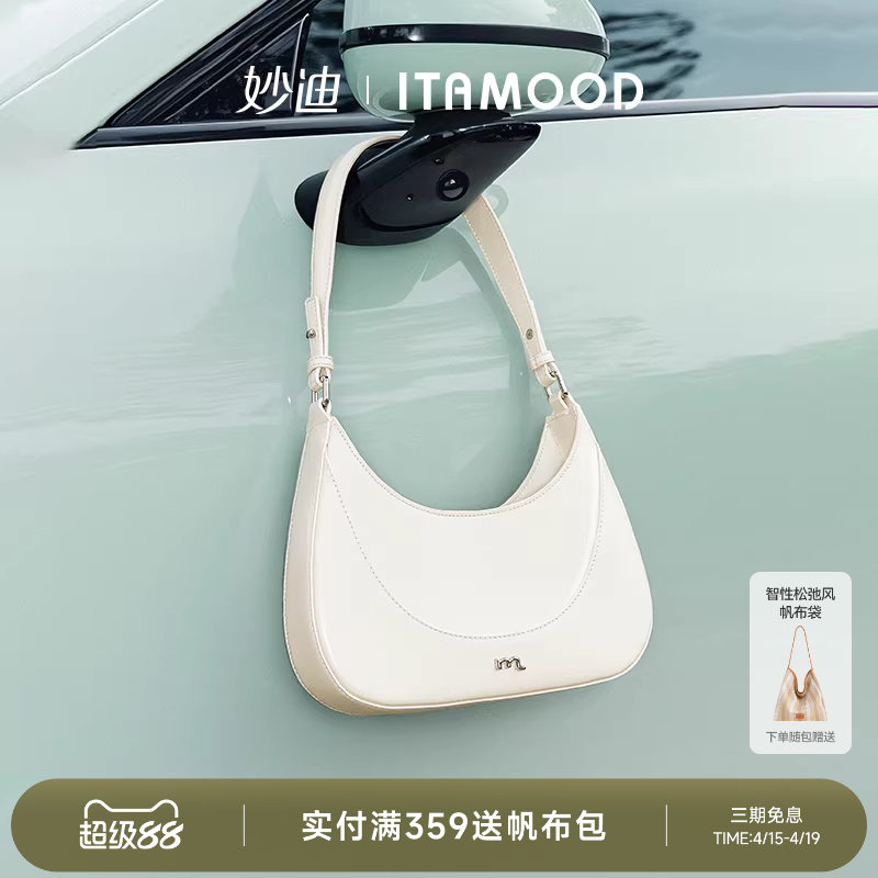 妙迪牛皮白色月牙包女士新款半月腋下高级精致法棍单肩手提斜挎包