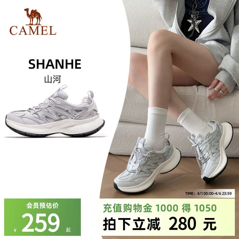骆驼山河运动鞋女款2026新款透气银色厚底增高复古休闲鞋老爹鞋男